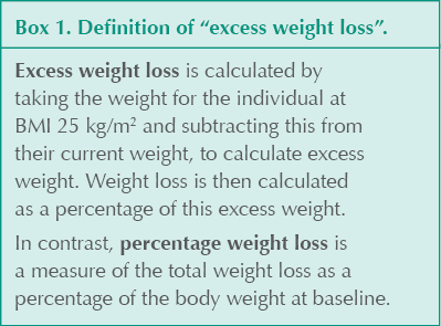 A recent systematic review and meta-analysis of the efficacy and safety of laparoscopic bariatric surgery in 3923 people aged 70 years and older, 70% of whom were female, demonstrated a mean excess weight loss of 55% at 1 year (Kapala et al, 2025). As expected, there were greater benefits from Roux-en-Y gastric bypass (RYGB) compared with sleeve gastrectomy. Significant improvements in several obesity-related diseases were observed, and major postoperative morbidity and mortality rates, at 2% and 1%, respectively, were both significantly higher in those over 70 compared with younger people undergoing MBS. Some studies have demonstrated significant excess weight loss (see Box 1 for definition) in people over age 70 years, including extended follow-up to 5 years, although many have only 1–2 years’ follow-up.