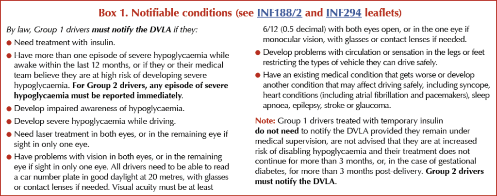 - Advise the individual of their legal requirement to notify the DVLA of any relevant condition, or if they meet the notification criteria in Box 1 or start insulin therapy.