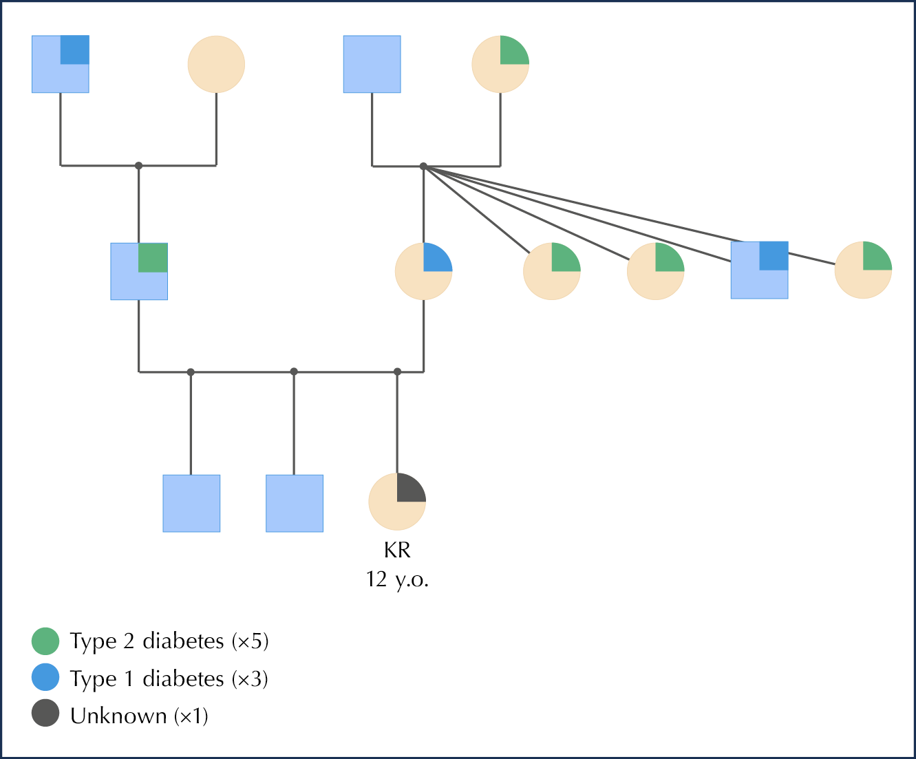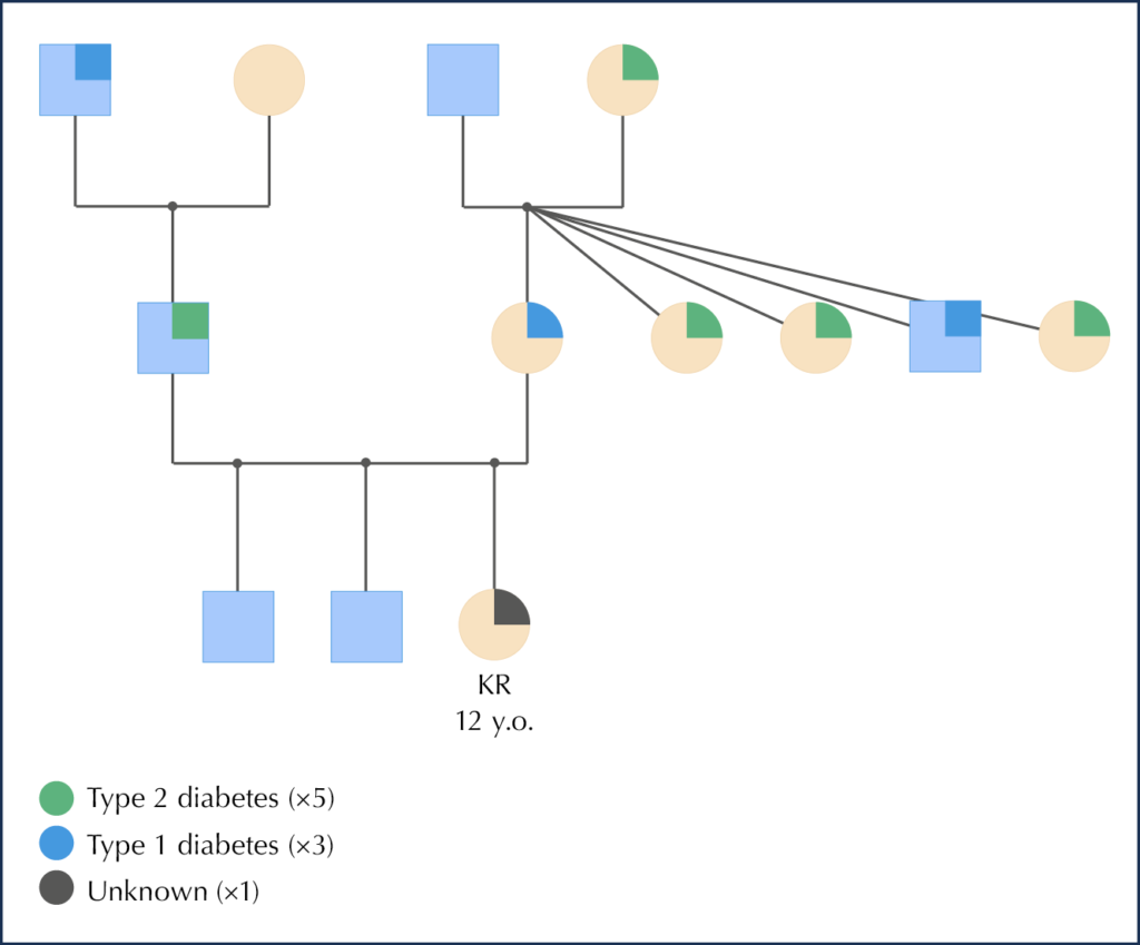 KR’s mother was diagnosed with type 1 diabetes at 15 years and her father with type 2 diabetes under the age of 16 years, with a continuous lack of adherence to his prescribed treatment regimen. There was history of metabolic disorder on both the mother and father’s side of the family. Her paternal grandfather was diagnosed with type 1 diabetes and had to have his leg amputated due to complications from suboptimal sugar levels. The family structure along with KR diagnosed in members of the family is shown in Figure 1.