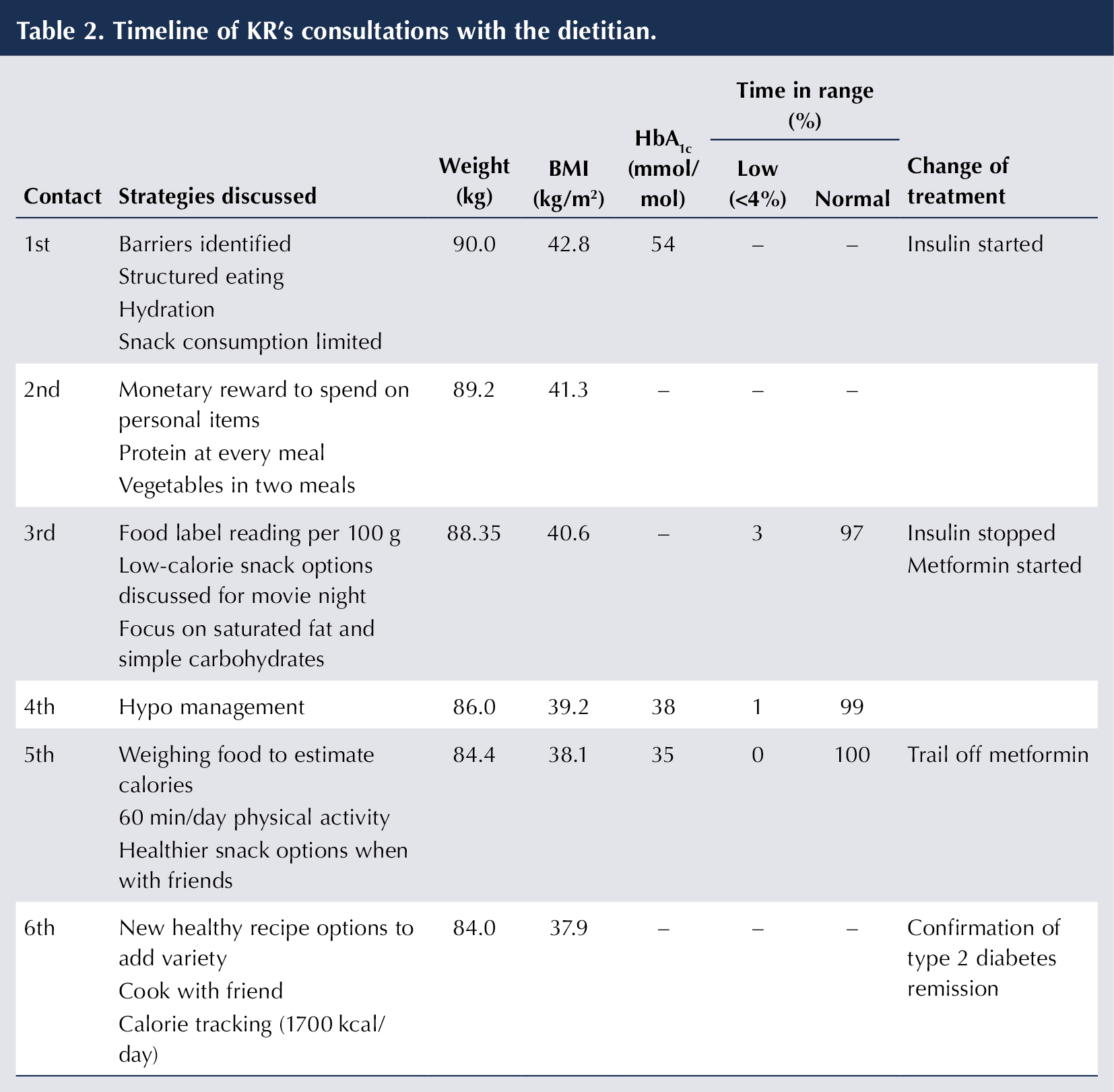 The application of the Libre 2 device was agreed for only 2 weeks before a scheduled clinic session to review her glucose levels. KR was growing weary of her limited selection of healthy dietary options. It was suggested she experiment with new recipes with familiar ingredients and to prepare meals with her friend. She was guided to establish a goal of consuming approximately 1700 kcal/day, using the MyFitnessPal app to track all food and beverage consumption. It was observed that offering precise instructions in quantifiable terms was a successful approach with KR. Consistently seeking guidance from a dietitian, establishing a limit of three objectives during each consultation and conducting follow-ups to overcome any barriers helped her maintain consistency and motivation. KR and her mother agreed to a review in 2 months. Once stability is achieved, follow-up can be extended to every 4 months, and so on.
